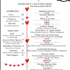 Valentine’s Day Dinner at Madeline’s Nibbles & Wine Plan to have a lovely dinner Valentine's Eve and Valentine's ... 14 Feb 5:00 pm Madeline's Nibbles & Wine