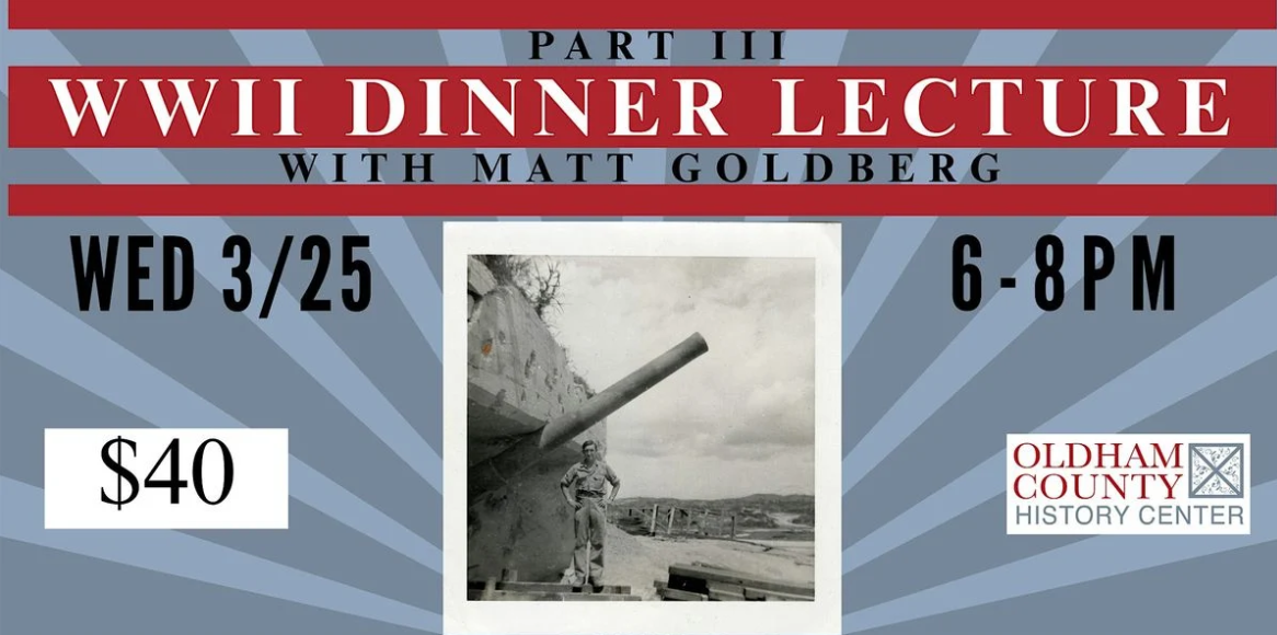 The Fires of Perdition – WWII From 1944-VDay Lecture Dinner WWII Dinner Lecture with Matt Goldberg: Pt 3 Part 3. The Oldham County History Center welcome back Military Historian Matt Goldberg for a new 3-part series. Buffet Dinner and Cash Bar. + Add to Google Calendar + iCal / Outlook export 00 days 00 hours 00 minutes 00 seconds