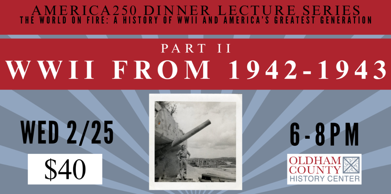 America250 Dinner Lecture Series – WWII from 1942-1943 WWII from 1942-1943 Part 2. The Oldham County History Center welcomes back Military Historian Matt Goldberg for a new 3-part series. Buffet Dinner and Cash Bar. + Add to Google Calendar + iCal / Outlook export 00 days 00 hours 00 minutes 00 seconds