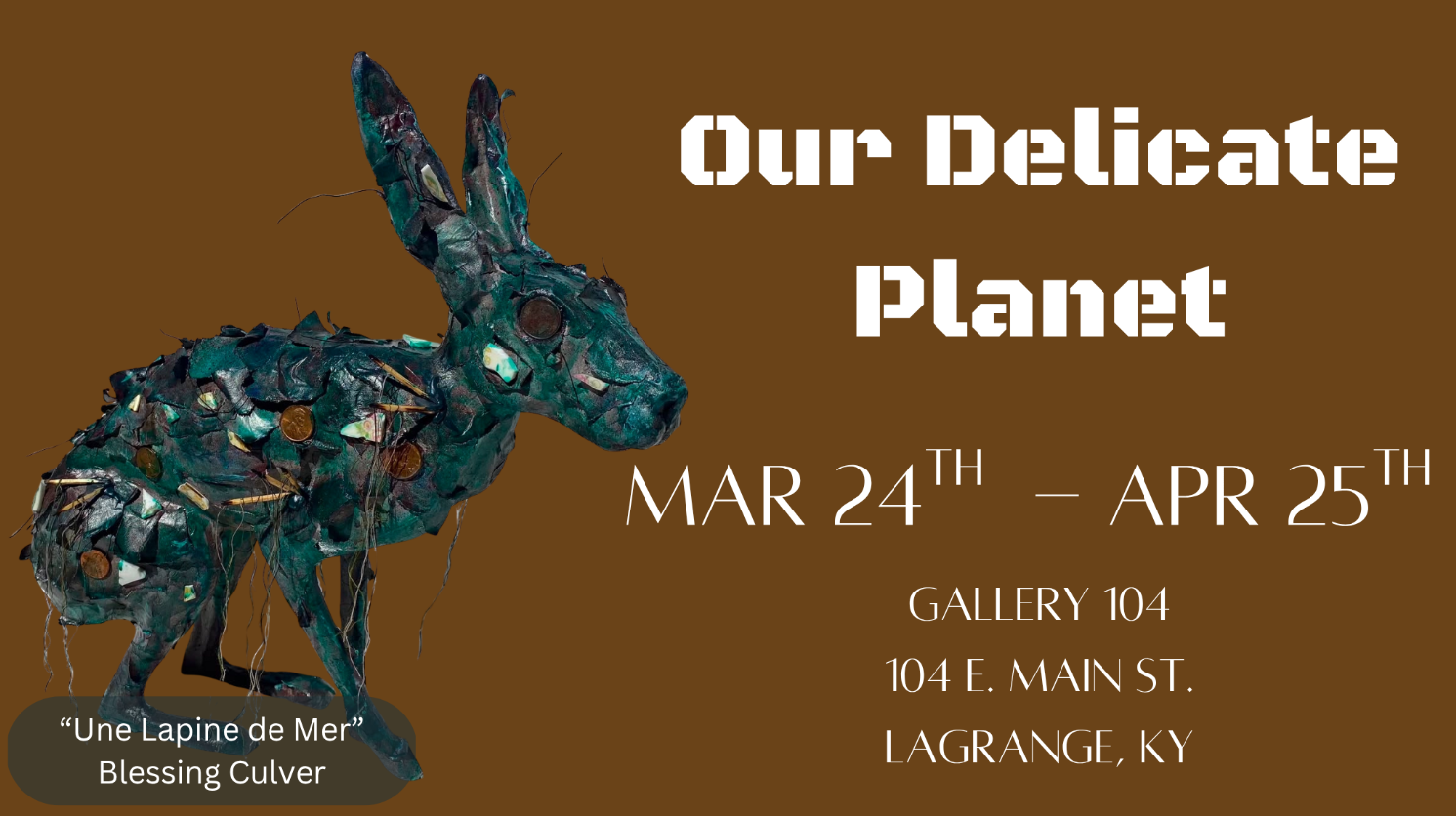 Gallery 104 presents a competitive art show including artwork that shows the earths fragility and supports the concept of reduce, reuse, recycle and reclaimed materials.  All subjects.