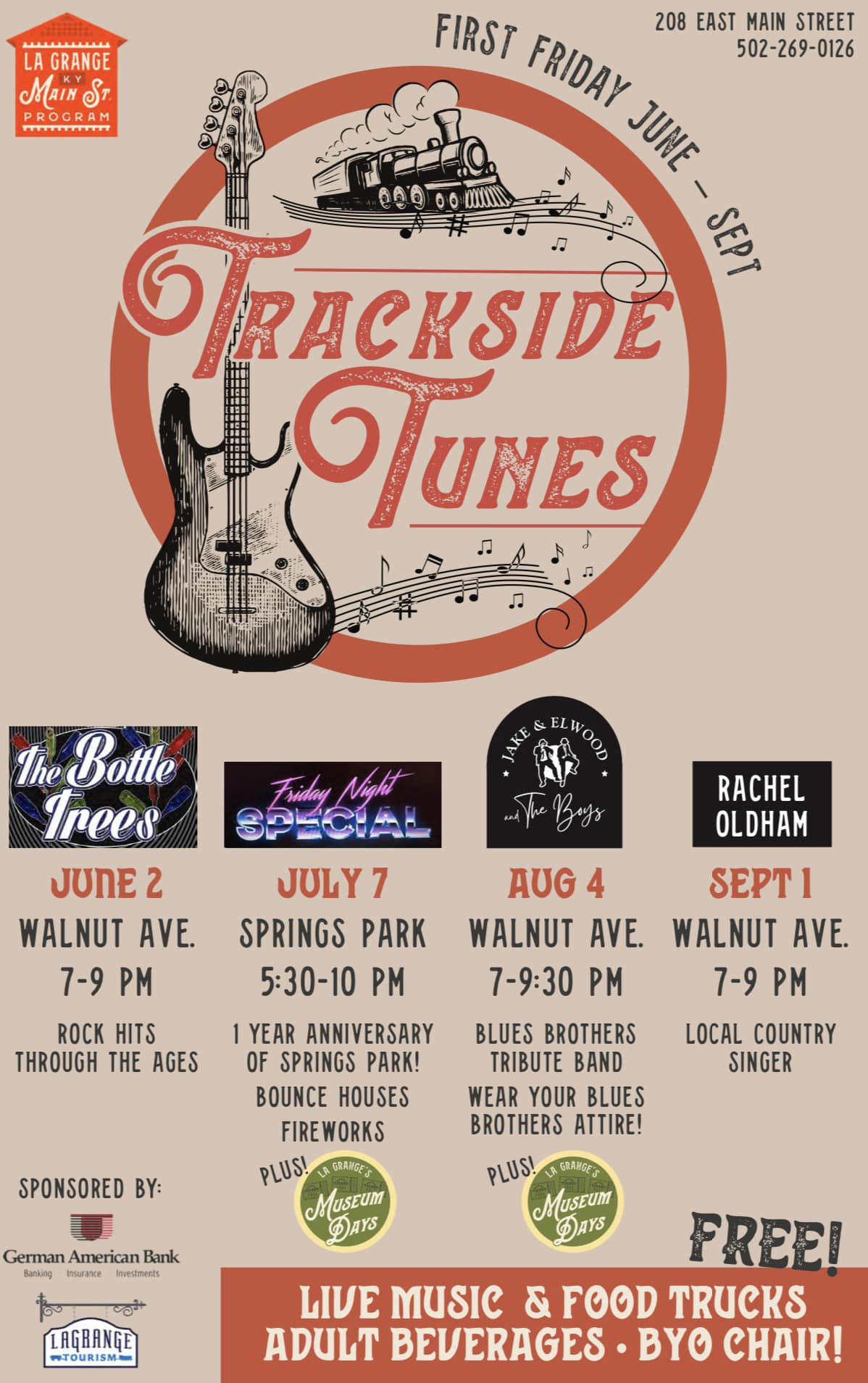 Grab your friends and lawn chairs and join the La Grange Main Street Program for Trackside Tunes, a block party concert series! Trackside Tunes will be held the first Friday, June through September. Food trucks and adult beverage businesses will be available.